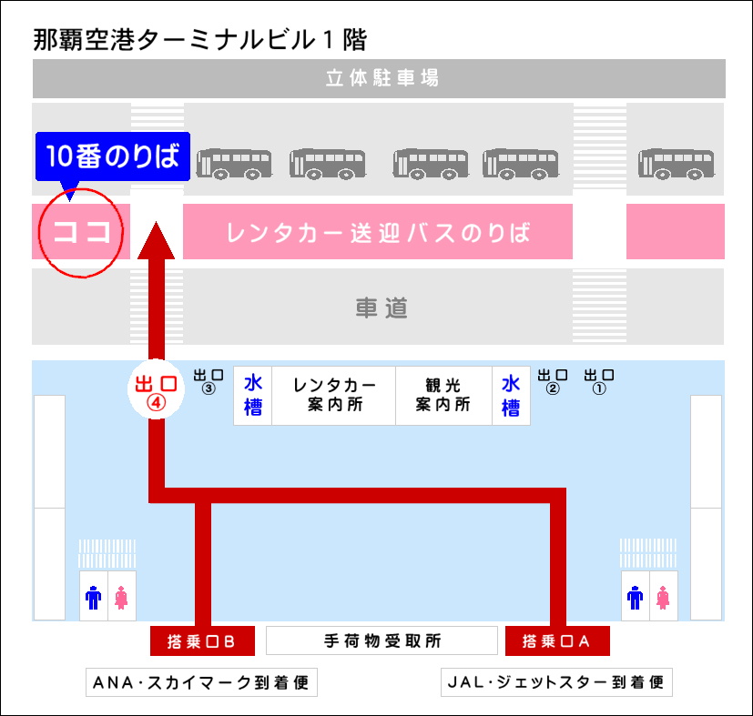 那覇空港に到着後、手荷物をお受け取りになりましたらそのまま出口より出て横断歩道を渡っていただくと「レンタカー送迎バスのりば 10番」前にてスタッフが送迎車へご案内させていただきます。